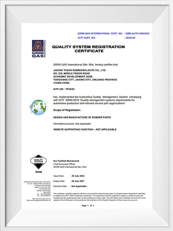 Es ist jedoch alles andere als ausreichend, ausschließlich auf die Kontrolle im Produktionsprozess zu stützen. Um die endgültige Qualität des Produkts zu gewährleisten, achtet Jiaxing Tosun auch besondere Aufmerksamkeit auf die Testverbindung. Das Unternehmen verfügt über ein internes Testlabor, das mit fortgeschrittenen und vollständigen Testgeräten ausgestattet ist. Diese Geräte umfassen, ohne darauf beschränkt zu sein, Härtentester, Zugprüfer, Alterungstestkammern usw., die die verschiedenen Leistungsindikatoren für feste Profile -Gummi -Extrusionen umfassend und genau testen können. Durch diesen Link kann das Unternehmen potenzielle Probleme im Produktionsprozess unverzüglich entdecken und lösen, wodurch sichergestellt wird, dass jedes versendete Produkt streng geprüft und getestet wird.